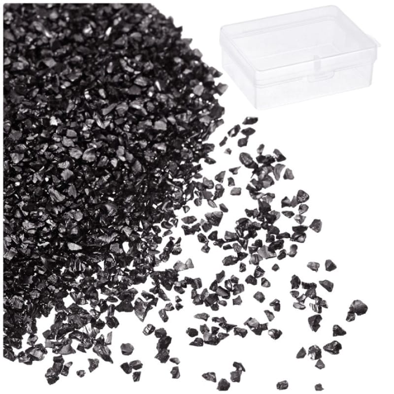 Sticla decorativă spartă, zdrobită, de culoare negru, este disponibilă în ambalaj de 50 g, cu granulație de 1–3 mm, colorată în întreaga secțiune. Combinată cu rășină epoxidică, este ideală pentru decorațiuni de interior și brelocuri.