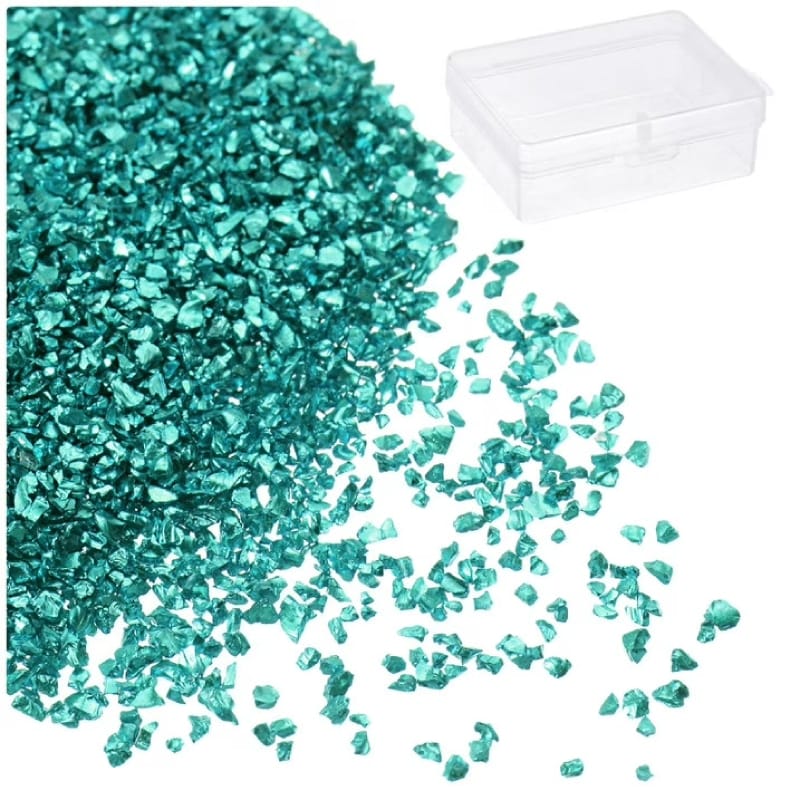 Sticla decorativă spartă, zdrobită, de culoare turcoază, este disponibilă în ambalaj de 50 g, cu granulație de 1–3 mm, colorată în întreaga secțiune. Combinată cu rășină epoxidică, este ideală pentru decorațiuni de interior și brelocuri.